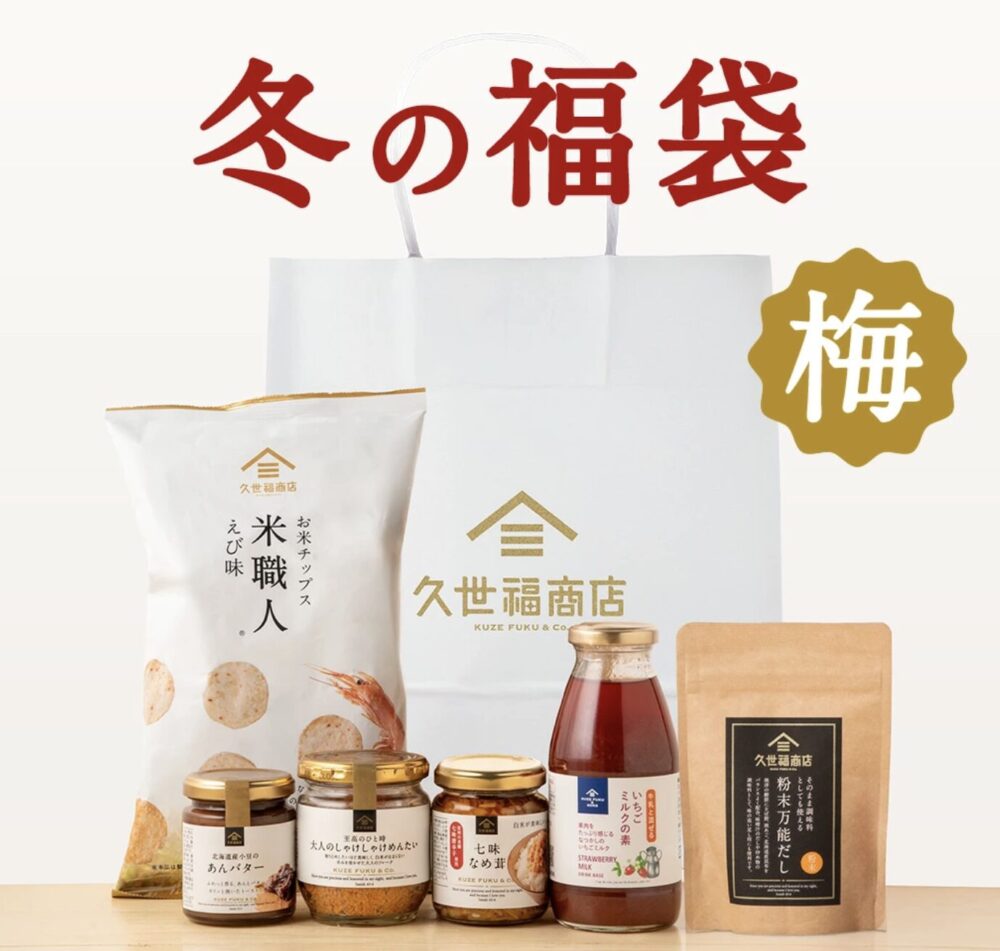 | 冬の福袋<梅> 3,580円(税込) ![]() 引用元 :サンクゼール久世福商店楽天市場店 | = 初めての方に!定番商品が勢ぞろい = ✨4,110円(税込)相当✨ 合計6点 ・粉末タイプの万能だし(40g) ・お米チップス米職人 ・七味なめ茸(130g) ・あんバター ・大人のしゃけしゃけめんたい(80g) ・いちごミルクの素 |