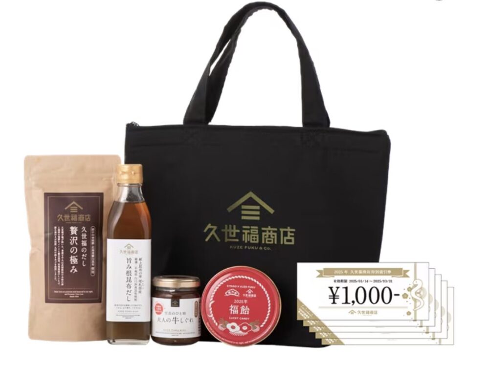 | 至福袋 7,000円(税込) ![]() ![]() 引用元 : 久世福商店・サンクゼール公式オンラインショップ | ・久世福のだし 贅沢の極み(5包入り) ・旨み根昆布だし(300ml) ・至高のひと時 大人の牛しぐれ(135g) ★2025年 福飴 (榮太樓總本鋪×久世福商店 コラボ商品) ★久世福商店 オリジナル保冷トートバッグ ★特別値引き券5,000円分 (1,000円×5枚) |